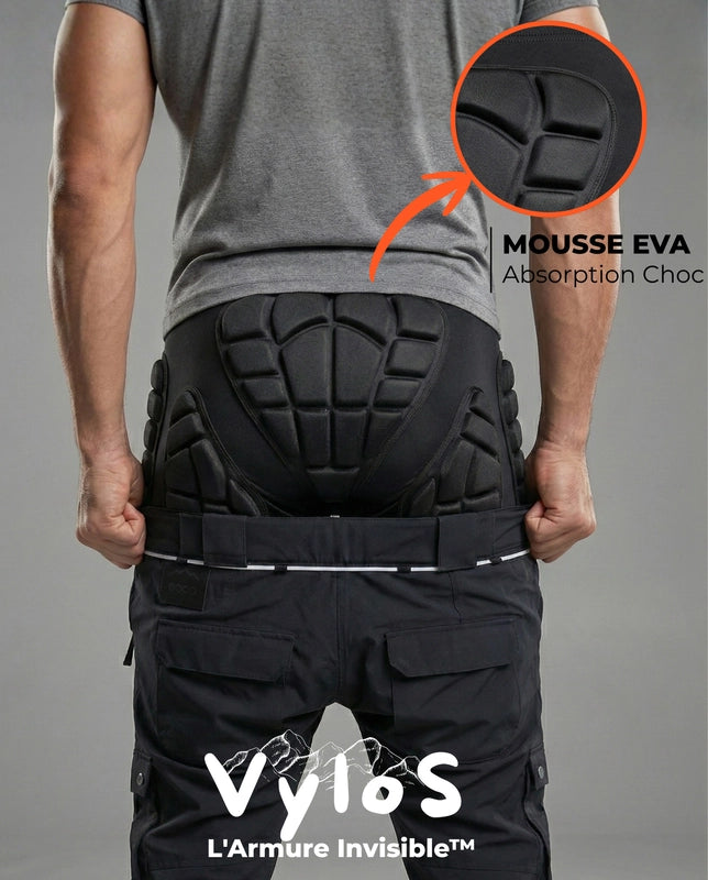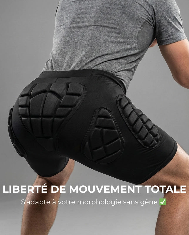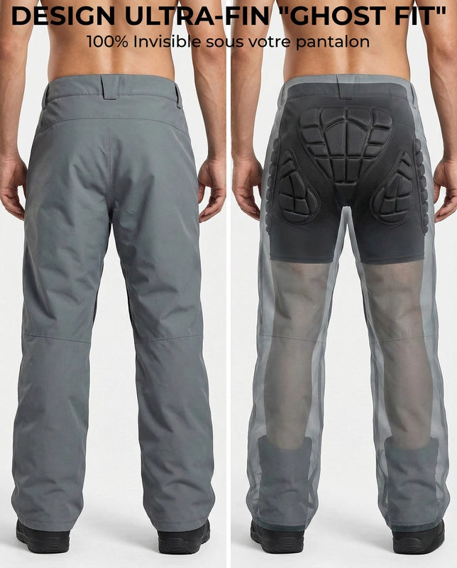 Contrairement aux coques rigides en plastique, notre mousse segmentée est flexible. Elle suit l'articulation de vos hanches sans jamais bloquer vos mouvements ou vos sauts.