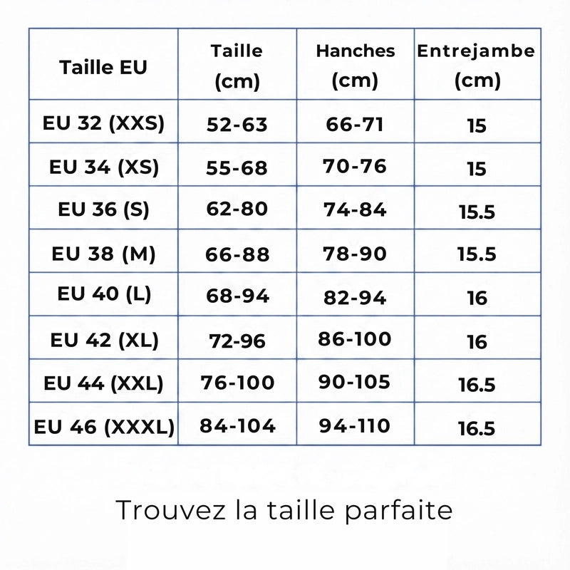 Comment choisir ? Référez-vous simplement à votre taille de pantalon habituelle dans le tableau ci-contre.